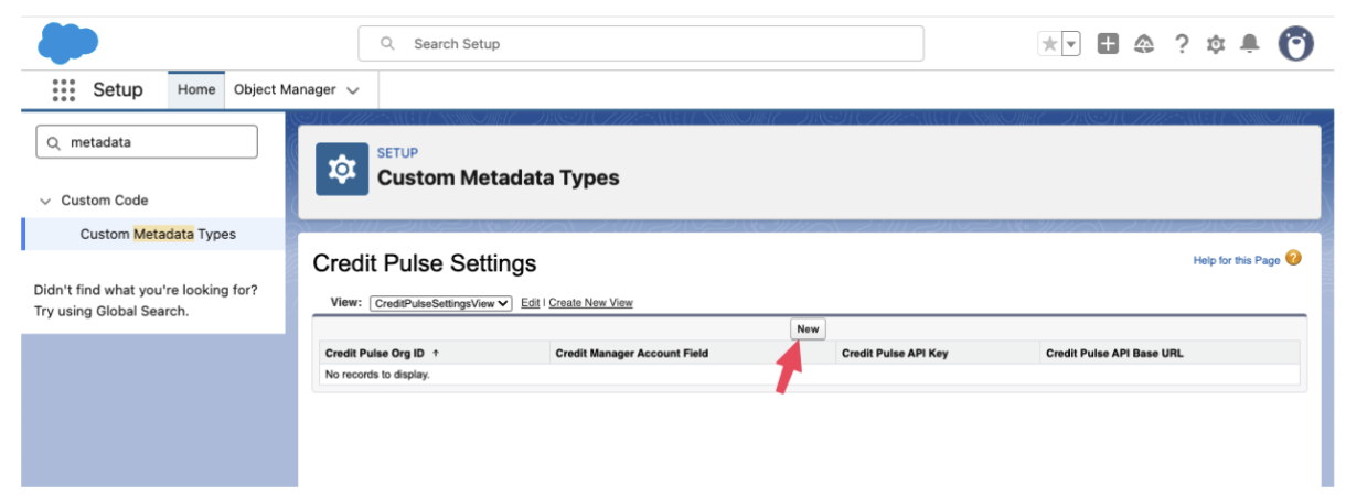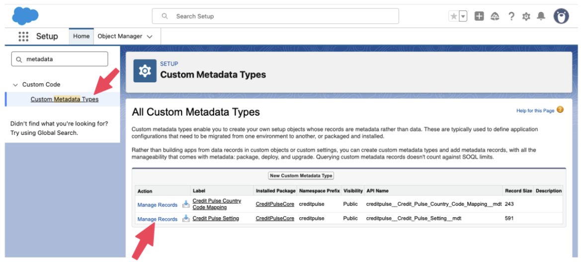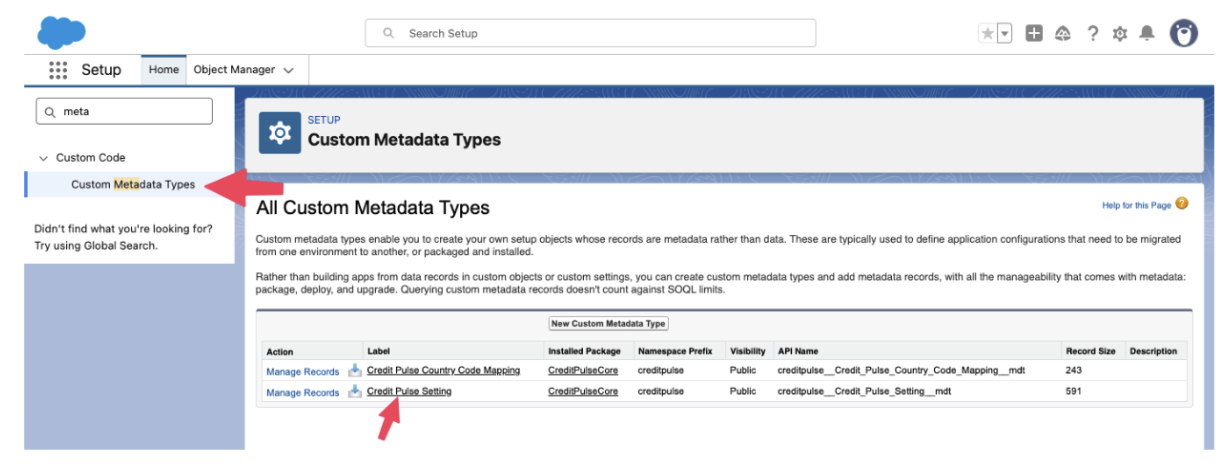 Go into Setup, and go to “Custom Metadata Types”. You should see a type labelled “Credit Pulse Setting”. Click “Manage Records”.