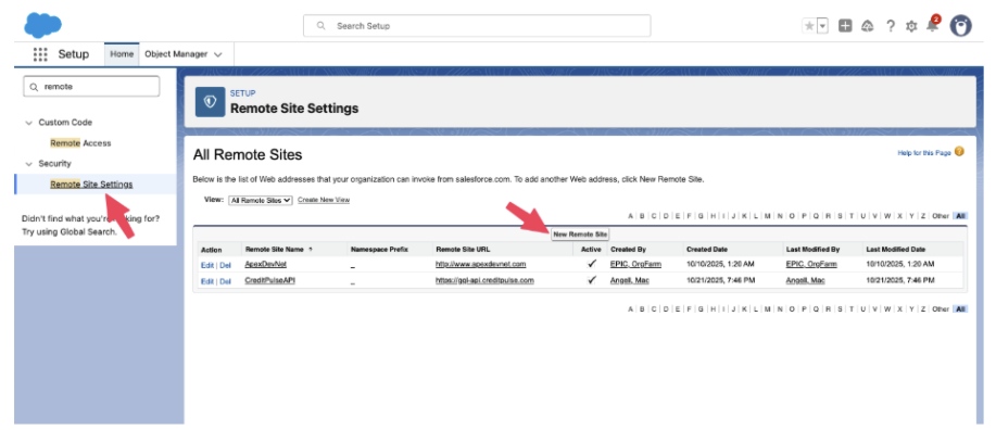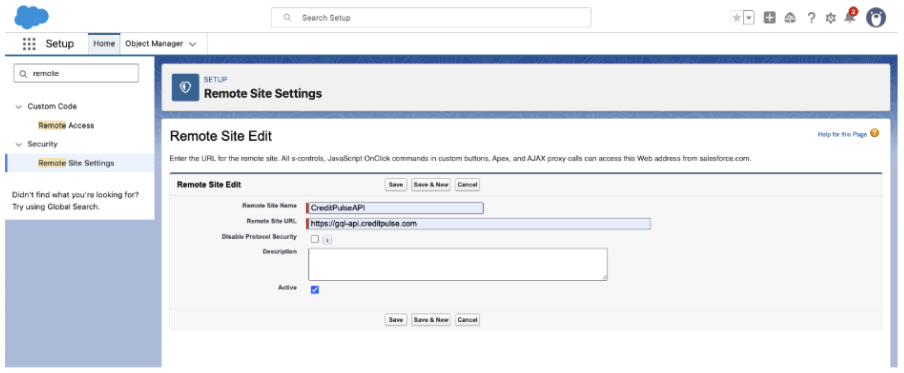 Lastly, you will need to add the Credit Pulse API to the list of Remote Sites to allow Salesforce to be able to reach the Credit Pulse API. Go to “Remote Site Settings”, click the “New Remote Site” button, and add “https://gql-api.creditpulse.com” as a new remote site.