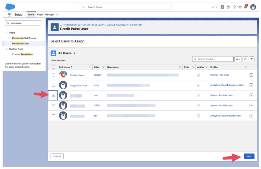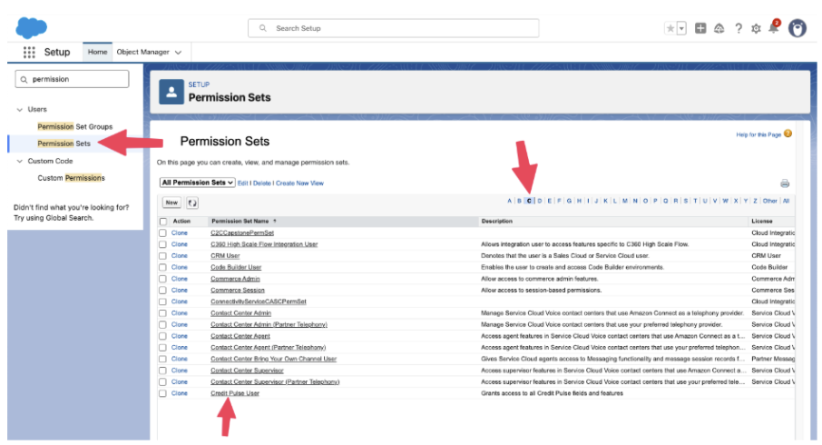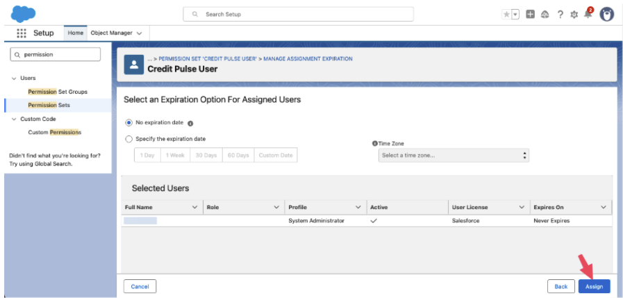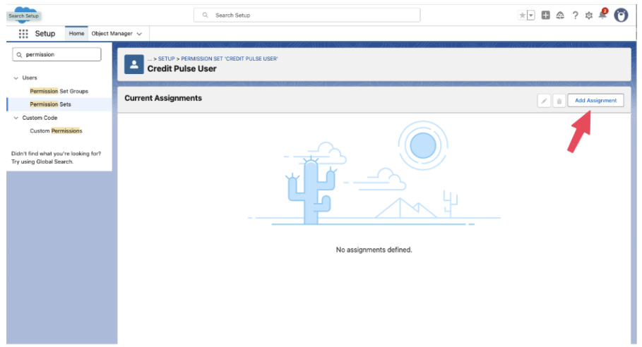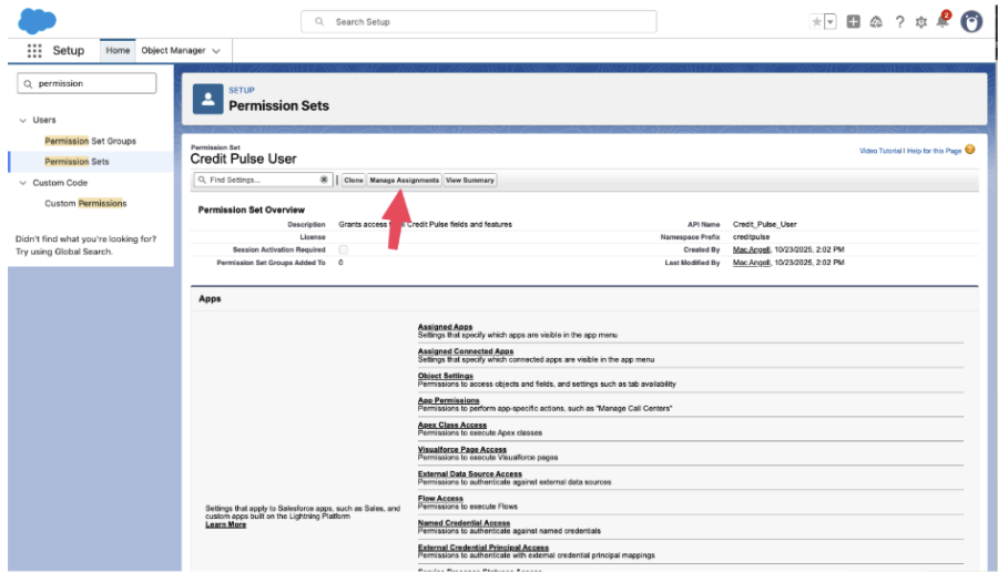 Then in Setup, go to “Permission Sets”, find the “Credit Pulse User” permission set, click “Manage Assignments” and add whoever needs access to toggle Credit Pulse on/off to be assigned this permission.