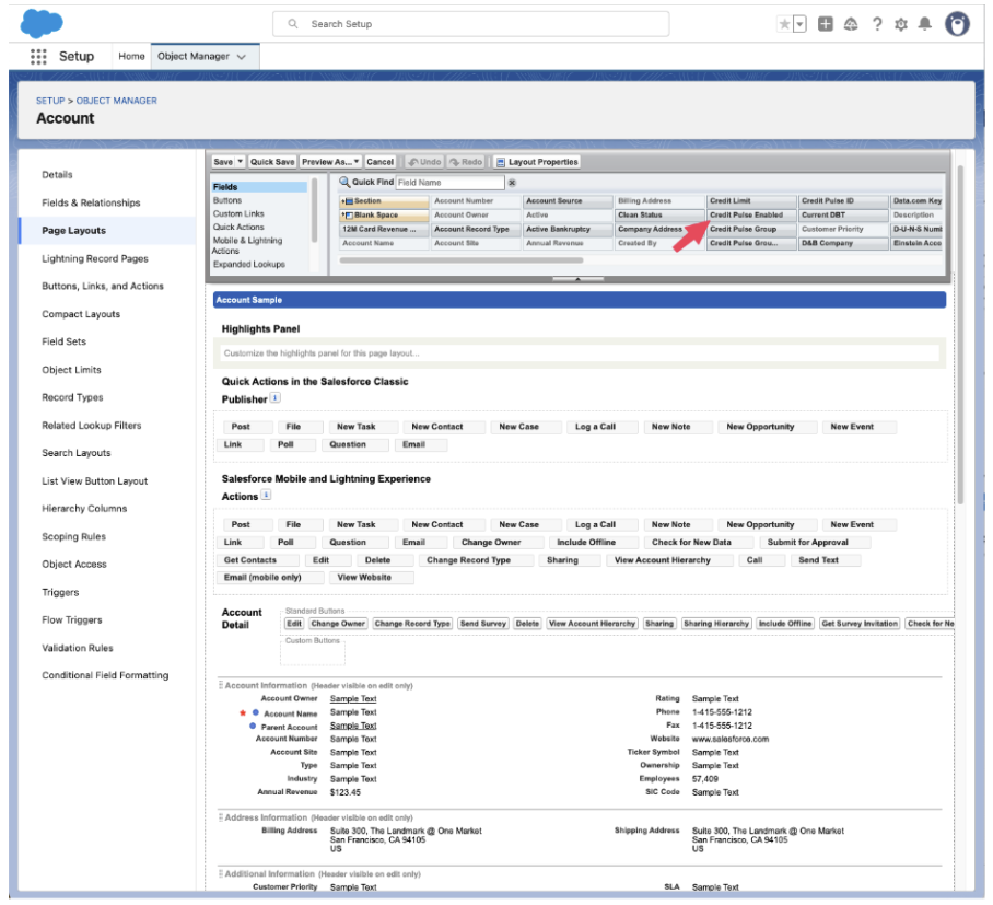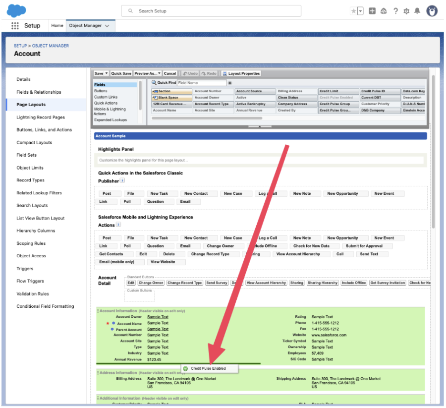 In order to use Credit Pulse for a specific account, it must be enabled on that account. There is a custom field called “Credit Pulse Enabled” that can be toggled on and off manually or by some other automated flow in your Salesforce instance. If you want to be able to manually enable/disable Credit Pulse for an account, you will want to add the field to your existing page layout. To do this, first go to Object Manager, click on the Account object, and select Page Layouts. Select a specific Page Layout to modify. Then look for the “Credit Pulse Enabled” field and drag and drop it somewhere into your page layout and hit Save.