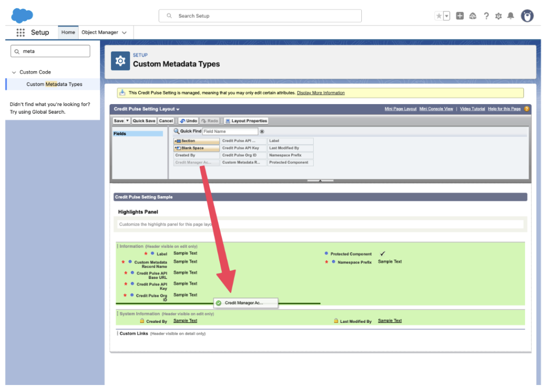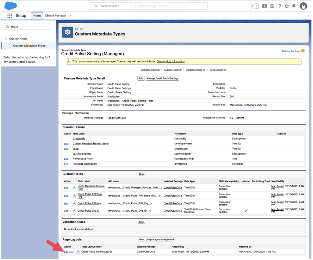 (Optional) If you need the ability to assign Salesforce users to accounts in Credit Pulse, you can specify the field on your Salesforce accounts that contains the credit manager. The way to do that is to add that field name to this metadata. You can do that by clicking the “Credit Pulse Setting” custom metadata type, editing the page layout to include the Credit Manager Account Field. Then you can go back and edit the record you created earlier and change the field name that corresponds to the field that contains the email address of your credit managers that are assigned to accounts.