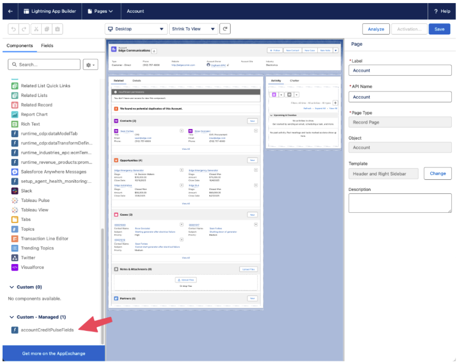 Once you are on the Lightning App Builder, you can click and drag the “accountCreditPulseFields” component to wherever you would like it be and click the Save button. If this is a new page, activate it.