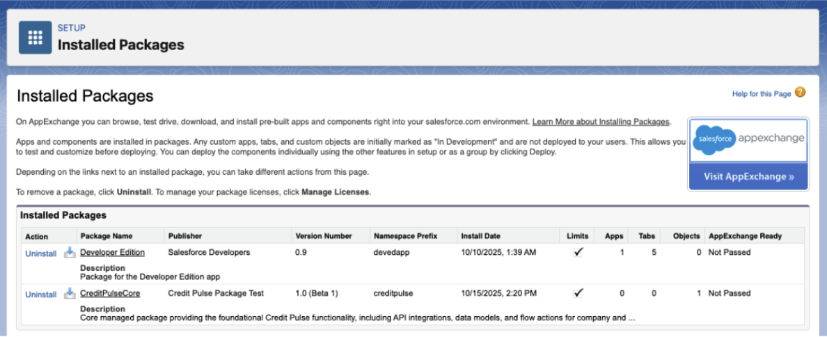 Once installed, you will see “CreditPulseCore” in your list of installed packages, however, you will need to set up a few other things: